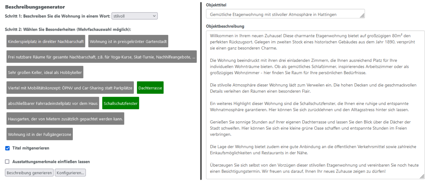 In unserer Immobilienvermarktungs-Plattform haben wir generative KI für Aufgaben eingebunden, für die konservative Entscheidungen von Vorteil sind. Beispielsweise übernimmt unsere KI die Generierung von Texten für Internetanzeigen. Ganz bewusst haben wir das System so programmiert, dass die Ergebnisse auf bereits vorhandenen Anzeigentexten basieren und in deren Stil verfasst werden. Das ermöglicht eine hohe Verlässlichkeit hinsichtlich der Qualität der KI-generierten Texte. Auch bei der Spracherkennung im Rahmen unseres Chatbots wollen wir Berechenbarkeit statt Innovationsgeist – damit das System auch wirklich das versteht, was tatsächlich geschrieben oder per Sprachnachricht eingesprochen wurde.