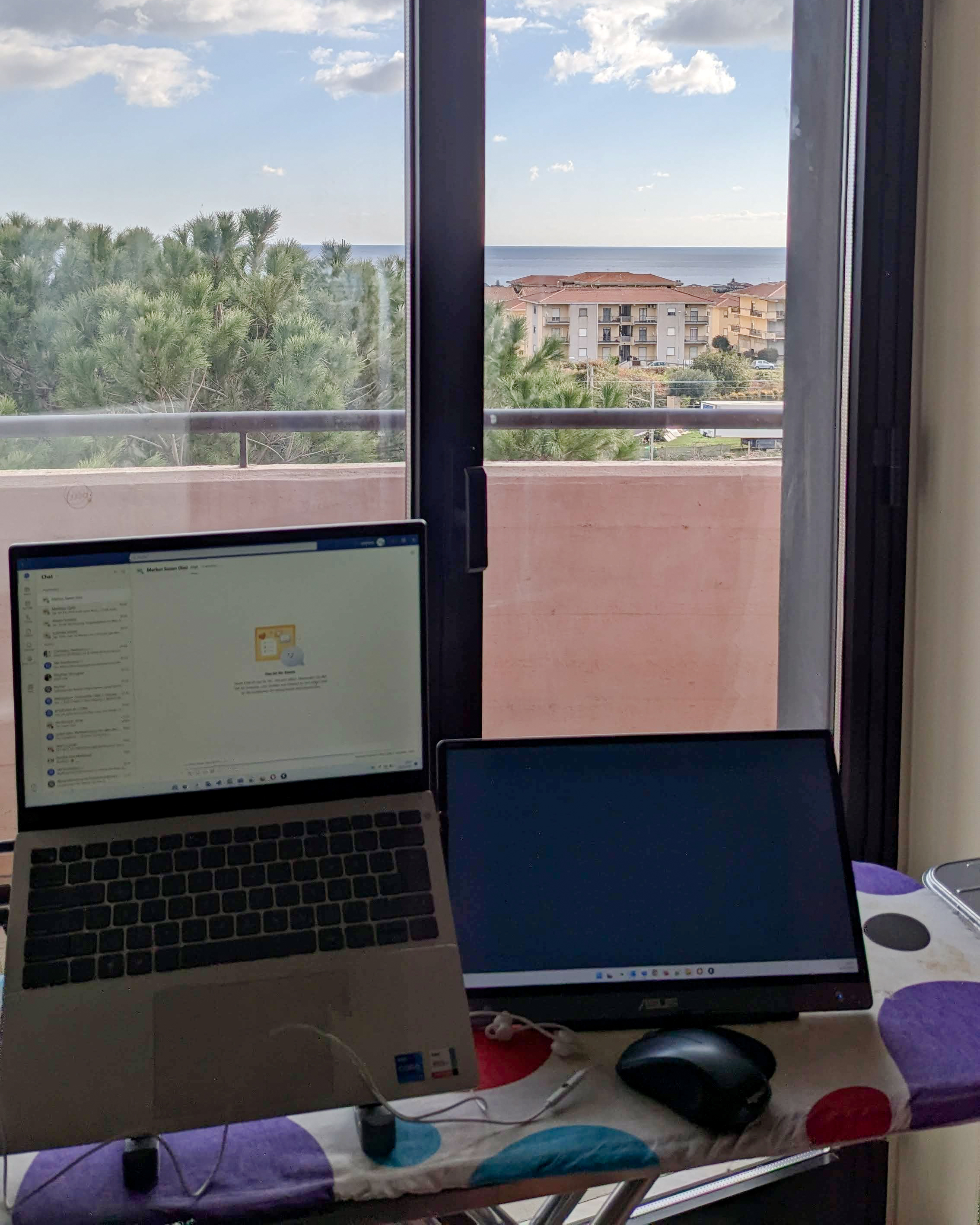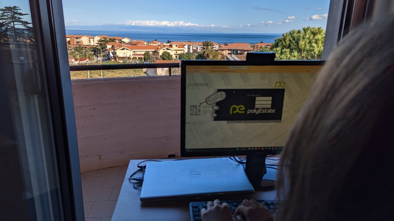 Wenn im morgendlichen Zoom-Meeting der Kameraschwenk plötzlich Meerblick mit einer schneebedeckten Bergkette zeigt, ist klar: da arbeitet jemand nicht von zu Hause aus im Ruhrgebiet, sondern in Sichtweite des Ätna auf Sizilien. Dort haben wir diesen Winter für mehrere Wochen ein geräumiges Feriendomizil angemietet, um unserem Team das Arbeiten in Urlaubsumgebung zu ermöglichen – auf neudeutsch "Workation", ein Wortmix aus "work" und "vacation".