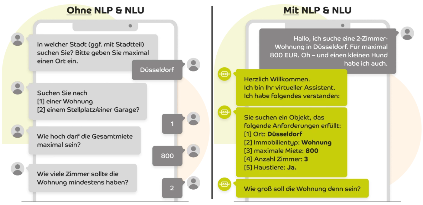 Oder Sie lassen den intelligenten Bot sich selbst trainieren – mit dem so genannten Machine Learning. Mit dieser Fähigkeit erkennt er Muster und Gesetzmäßigkeiten in den Texten, wodurch er seine Handlungsfähigkeit eigenständig erweitern kann. Er wird sozusagen zum Autodidakten. Schreibt jemand beispielsweise "Ich suche eine Wohnung in Düsseldorf", wird ein untrainierter Bot zunächst noch fragen: "Wo suchen Sie die Wohnung?". Erhält er daraufhin die Antwort "Düsseldorf", lernt er, dass der Städtename der Indikator dafür ist, dass dort Wohnungen gesucht werden. Bei der nächsten Anfrage wird er somit die Intention hinter der Frage direkt beim ersten Mal erkennen.