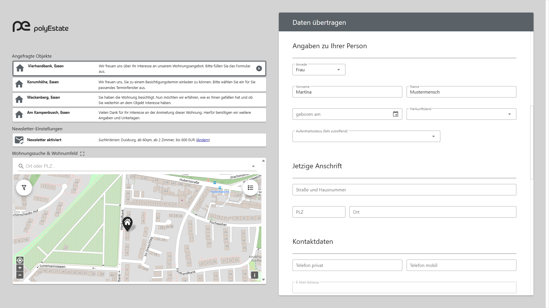 Bis zur erfolgreichen Vermietung einer Wohnung bedarf es unzähliger Interaktionen mit Interessenten und aufwändige Datenerfassungen. Erstere erfolgen häufig per Mail und Telefon, letztere per Online-Interessentenbögen – all dies kostet auf Vermieter- sowie Interessentenseite viel Zeit und Nerven. Das CRM von polyEstate One bietet hierfür eine DSGVO-konforme Lösung, um diese Prozesse für alle Beteiligten effizienter und übersichtlicher zu gestalten: das Interessentencockpit.