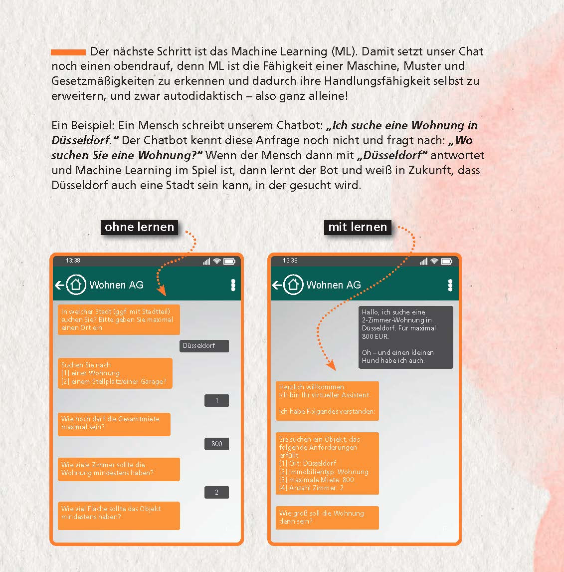 Zur Sicherheit stellt der Chatbot eine Rückfrage, z.B. “Sie suchen eine Wohnung in Düsseldorf? Ist das richtig?” Wenn die Antwort nein lautet, erfolgt die Ausgabe des Menüs. So kann der Kunde dann die korrekten Informationen problemlos übermitteln.